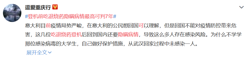 知名美食博主@逗爱重庆行 (粉丝量:18.7万)认为:“在疫情防控外防境外输入病例的重要时期,对于这种妨害传染病防治犯罪危害公共安全的,就应该依法予以处理以儆效尤。”