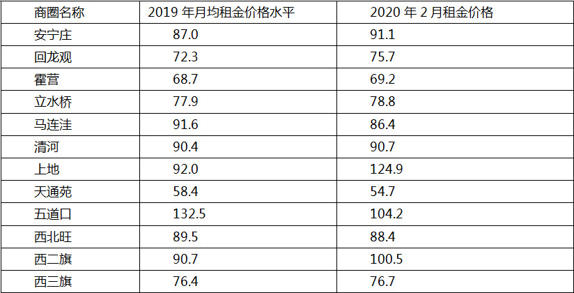 西二旗工作生活圈辐射商圈租金水平(元/平米/月) 数据来源:贝壳研究院